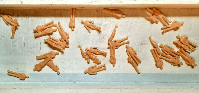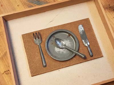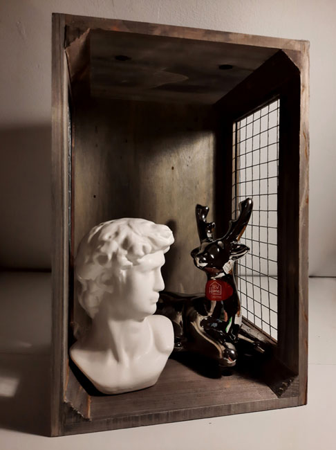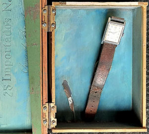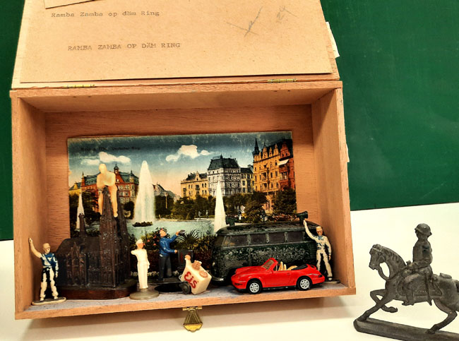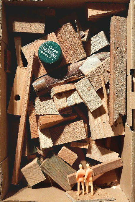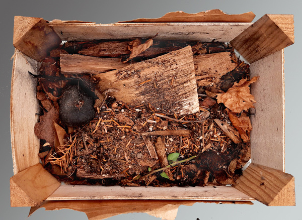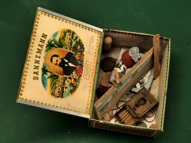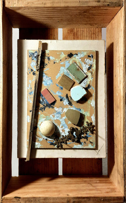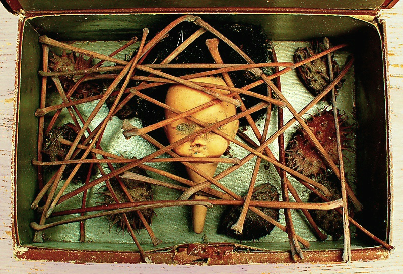 Bestandteile: Ein Biedermeier-Kästchen, ein Geschenk von Fräulein Ortmann, der ehemaligen Schulsekretärin am Gymnasium Düsseldorferstraße in Köln Mülheim, Stile von Weinblättern, die ich wegen ihrer Braunfärbung mag, ähnlich dem Farbton Terra di Siena, abgeplatzte Kastanienhüllen aus dem Rheinischen Villewald, im Braunton rötlicher und dunkler, ähnlich Kölnerbraun, und der Kopf eines Plstikpüppchens von der Playa Estanyet, Antreibgut, ein Objet trouvé aus meiner Sammlung, Alcanar (Tarragona), der Inhalt des Kästchens ist vorsichtig zusammengelegt wie die Mikado-Stäbchen eines Kinderspieles, insgesamt nicht transportabel und wurde von mir dokumentatorisch fotografiert.Größe ungef. 24 x 16 cm, die Bestandteile haben sich seit mehreren Jahren zusammengefunden. Meine nicht transportablen Objekte und Objektkästen gehören zu der Gruppe der caixes immòbils.