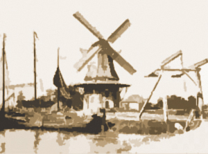 Alte Windmühle Warsingsfehn, Moormerland, Leer, Ostfriesland - Verschiffung des Mahlguts auf Fehnschiffen über Fehnkanäle, Klappbrücke, 19. Jahrhundert, Grafik nach der Widergabe eines alten Fotos auf der Infotafel der Gemeinde Moormerland im Bereich der Mühle