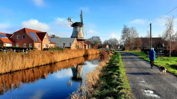 Der Warsingsfehnkanal ist weiterhin in aller Pracht vorhanden, Lastkraftwagen haben allerdings den Fehnschiffen die Transportarbeit abgenommen.