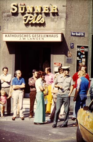 zum foto: der hubsche hans langen, links, wirt vom katholischen gesellenhaus, betrachtet mit anderen, z.b. erich vom zeitungsladen gegenüber, blaues hemd links, einen Verkehrunfall auf der dellbrücker hauptstraße, ecke von quadtstraße, um 1970