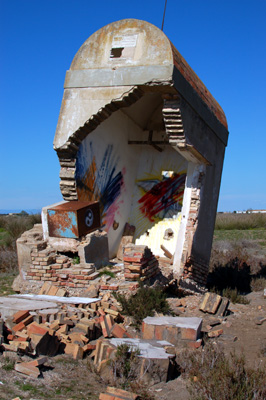 die zweite location lag an der carretera de baladares auf sandigen salzbinsenweiden der halbwilden deltarinder in der nähe der urbanització l´eucaliptus. hier war ein kleines trafo-gebäude, das wir jahrelang fotografisch begleitet hatten, durch langjährige erosion unterspült worden und auseinandergebrochen. neben fotos entstand aus herumliegendem eisenschrott eine kleine freistehende stele.