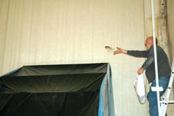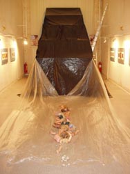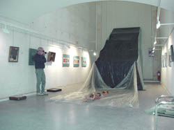 El movimiento del aire y de las películas negras, azules y tranparentes de polietileno por un ventilador visualiza el tema de la exposición: tot flueix.