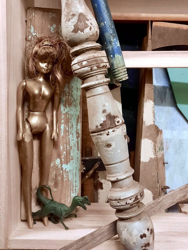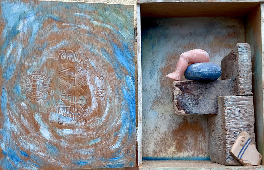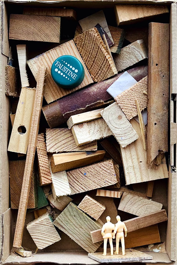 objets trouvés, Komposition aus Holzfragmenten in einem Versandkarton