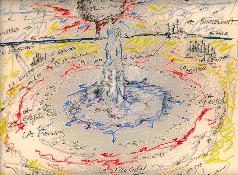 2015 das EndeBeabsichtigt ist, eine Installation auf den Steinen der Mündung des Rio Cenia (Mitten zwischen Katalonien und der Valencianischen Gemeinschaft) mit Sicht auf das Mittelmeer und die Plattform des problembehafteten Castors* (die Angst) zu errichten. Der 5 Meter hohe Obelisk aus Eis (die Kälte) schmilzt während einiger Tage und Nächte. Die den Obelisken umgebenden Kreise aus Rot und Gelb bestehen aus natürlichen Pigmenten der Flussmündung (Erde und Sand) und werden beim Passieren des Schmelzwassers die Umgebung nicht kontaminieren. Nach einigen Tagen wird sich die Installation ohne menschliches Zutun allein durch Sonne, Wind und Wasser aufgelöst haben.