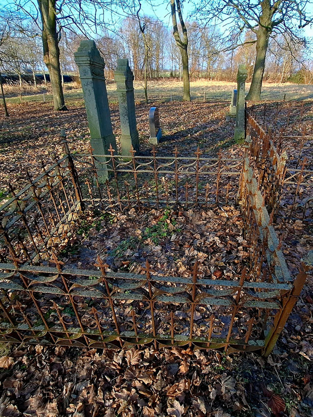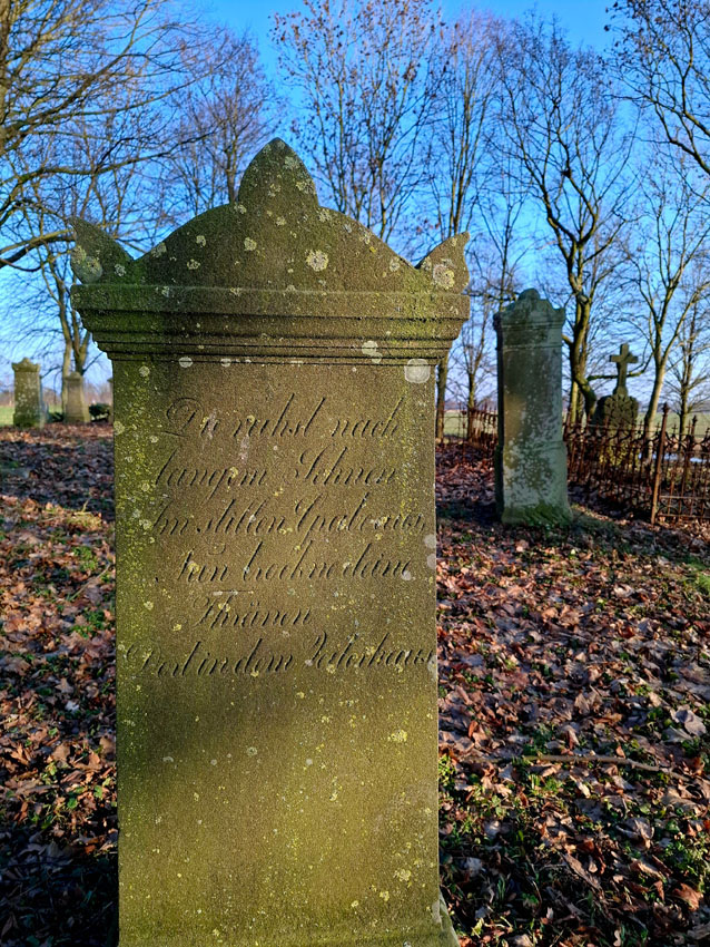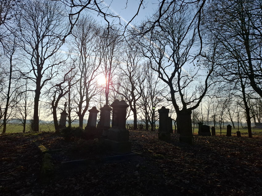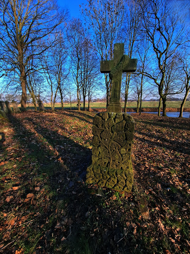 Ich suche rechts einen Weg durch das abgestorbene Dickicht, um die zwischen den Baumstämmen ungeordnet stehenden Kreuze der Grabstellen auf dem Plateau der Warft im Gegenlicht fotografieren zu können. Ich muss aufpassen, dass ich nicht in den zugefrorenen Graben hinter mir abrutsche. Nach einer Serie von digitalen Fotos im Kleinbildformat mit einem klassischen 24mm Weitwinkel und Dokumentationsfotos mit dem Handy, steige ich zwischen den schief stehenden von Flechten grünlich verfärbten Grabstelen zur Kuppe der Warft auf. Die Stelen sind sorgfältige Steinmetzarbeiten, jahrhundertelang den klimatischen Angriffen des Wetters ausgesetzt.