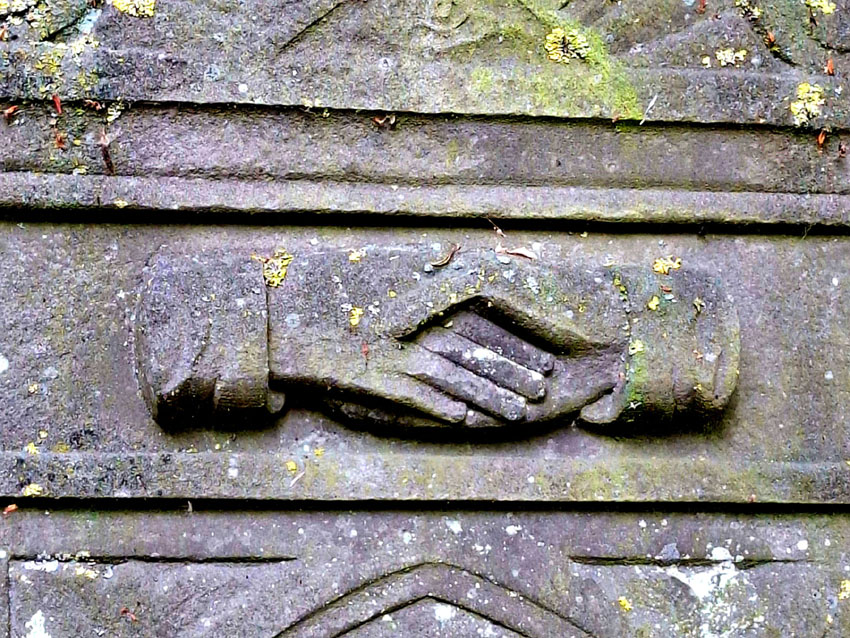 Das Symbol der zwei Hände im Augenblick des Händeschüttelns mit einem 'Auf Wiedersehen' verbunden als Symbol der erhofften Auferstehung und des Wiedersehens mit Familie, Freunden und Nachbarn