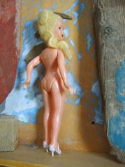 In der nachmittäglichen Septembersonne an der Place de Marché zeige ich die auf dem Flohmarkt für eine Objektinstallation erstandene italienische Billigversion einer Barbiepuppe. Eine Bekannte kommentiert den Fund fraulich abwertend: ´Die ist ja schon wieder blond´.