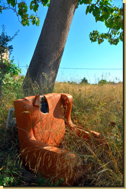 Die verkommene schmale Asphaltstraße erscheint wie ein langer Flickenteppich mit vielen tiefen Löchern, Rissen und Brüchen. Sie wurde in den letzten Jahrzehnten wenig, und wenn, dann lustlos ausgebessert. Mit einer Schaufel wurde dann etwas Asphaltsplit in die Schlaglöcher geworfen, verteilt und mit dem Schaufelrücken plattgeklopft. Es gibt Straßen, die sich in einem so grandios verkommenen Zustand befinden, dass ein weiteres Ausbessern sinnlos wäre, eine ehrenrührige Beleidigung eines jedes Straßenarbeiters. Jeder Benutzer dieser Straße schickt an dieser Stelle ein Stoßgebet zum Himmel, gerade hier, wo eine kleine Kapelle im tief dunklen Schatten alter Platanen steht. Grob gebaut aus Bruchstein, gedeckt mit verblichenen Dachziegeln, die überzogen von ausgetrockneten Flechten sind, wartet diese Haltestelle des Glaubens auf ihre Erlösung. Durch ein Eisengitter vor dem Eingang sieht man in eine finstere Nische, die einen feucht modernden Geruch ausströmt. Zwei weiße Gebetskerzen in durchsichtigen Plastikschälchen flackern vor einem verrußten Heiligen, dessen Identität man nur erraten kann. Der geordnete Zustand der Nische und das Brennen der Kerzen deuten auf jemanden, der sich um dieses Elend kümmert. Links und rechts von der Heiligenfigur stehen in alten gläsernen Orangensaftgefäßen, deren Böden mit weißem Friedhofskies beschwert sind, Sträuße verblichener weißlich-staubiger Plastiklilien. In die Blütenböden sind jeweils gelbliche raue Zapfen als Blütenstempel gesteckt. Die Verbindungen unterschiedlich farbiger Teile dieser Plastikblumen lassen mich an die Legosteine meiner Kindheit denken.