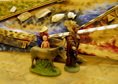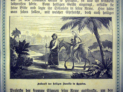 vor dem chorraum waren auf einem absatz einige halbmeter große motivkästen mit bunten gipsdarstellungen der flucht der heiligen familie nach ägypten ausgestellt, maria mit dem jesuskind auf dem esel reitend in begleitung von dem den esel führenden josef, das ganze jeweils umgeben von künstlichem geblüm hinter verglasung. interessiert sah ich mir die kästen an, die sich alle im aufbau ähnlich waren und wohl erbstücke verschiedener familien waren. zur weihnachtszeit war es wohl tradition, sie hier als narrative fortsetzung der aufgebauten krippe auszustellen. solche kästen hingen noch, auch mit anderen motiven, an manchen häusern der altstadt, immer im ersten stock. nachts waren sie mit einem schwachen elektrischen licht beleuchtet.