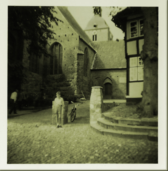 die zwei fotos zeigen meine damals 34jährige mutter und mich, gegenseitig aufgenommen, in burg auf fehmarn. mein fotoapparat damals war eine 6x6 balgenkamera namens foitzik vom trierer kamerawerk, mit deren technik ich als zehnjähriger mehr schlecht als recht zurechtkam, daher wohl die mangelnde bildqualität.