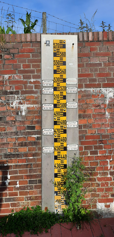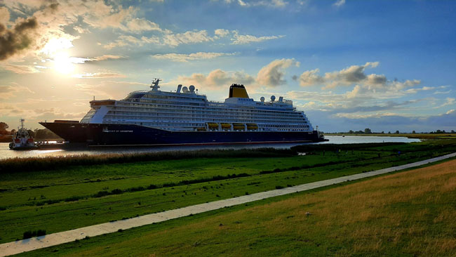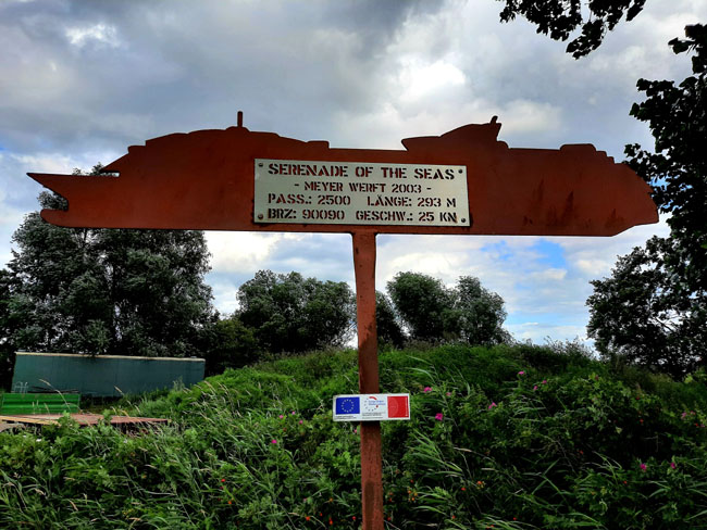 Die Passage eines so gigantischen Kreuzfahrtschiffes passt nicht einfach so, es bedarf vieler Vorarbeit, bis diese Route von der Werft in Papenburg bis zur Mündung der Ems bei Emden befahrbar ist. Die Brücken müssen die Durchfahrt freigeben können, die Hochspannungsleitungen nicht zu tief hängen und der Wasserstand der Ems muss hoch genug sein, wofür ein Emssperrwerk zwischen Gandersum und Nendorp auch gebaut wurde, das den Pegel der Ems aufstauen, aber auch gegen Sturmfluten vom Dollart her sichern kann. Im Wikipedia Artikel über das Sperrwerk werden die nicht gerade wenigen Sturmfluten der letzten Jahre aufgezählt. Zusätzlich wird die Ems ständig ausgebaggert, um den nötigen Tiefgang für große Schiffe zu ermöglichen. Der ausgebaggerte Schlick wird momentan als Feldbelag getestet, ob fruchtbar, giftig oder beides.