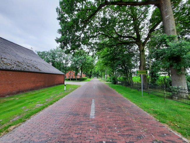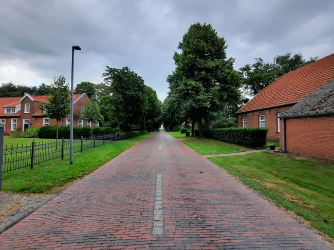Vor dem Eingang zum Kirchengrundstück stehe ich auf der Mitte der aus feinen Mauersteinen gelegten Ayenwolder Straße und blicke nach Süd-Westen in eine weitere Zentralperspektive. Alles befindet sich in einem sehr sauberen und geordneten Zustand, wie von Jan Vredeman de Vries mit spitzem Silberstift und langem Lineal gezeichnet. Beeindruckend!