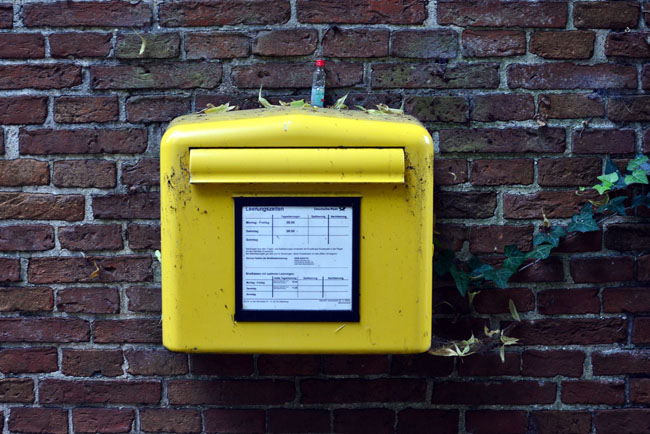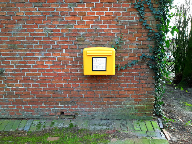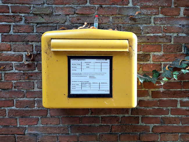... und ewig grüßt das Murmeltier. Fünf Wochen später habe ich den Briefkasten noch einmal fotografiert. Wenig hat sich verändert. Das Efeu ist gewachsen und die Leerungen fanden sicher regelmäßig statt. Zäh zieht sich die Zeit wie eine zerfließende Uhr in einer surrealistischen Malerei von Salvador Dalí.