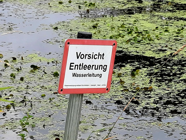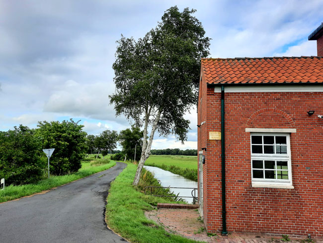 Es müssen in dieser vom Menschen veränderten Landschaft unterschiedlich hohe Wasserstände in den Kanälen überbrückt werden. Dazu dienen die Schöpfwerke. Hier das Schöpfwerk zwischen dem Hollener Schöpfwerkstief, dem hier zu sehenden Kanal, und dem größeren Nordgeorgsfehnkanal auf dem vorherigen Bild. Auf dem kleinen Schild neben dem Fallrohr der Regenrinne des Schöpfwerks steht: Betreten der Schöpfwerksanlagen verboten - Der Obersielrichter.