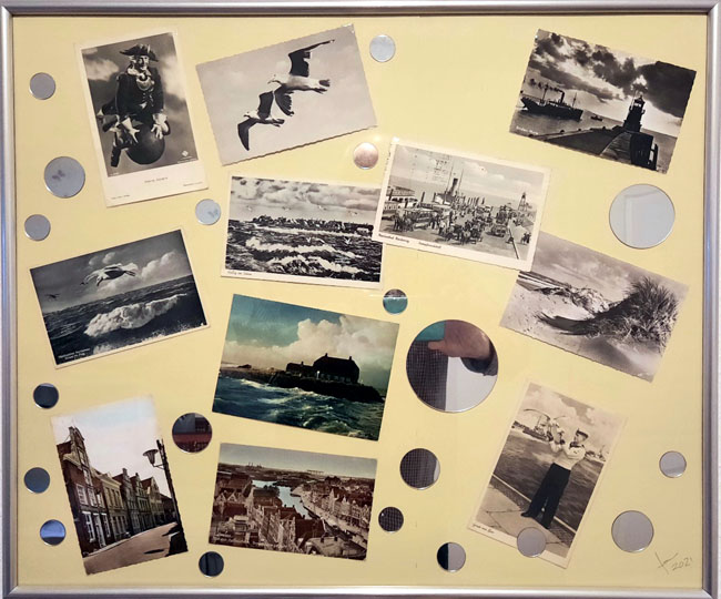 Die Spiegelelemente erfüllen die Aufgabe, die Gegenwart des Betrachters in die Abgeschlossenheit einer vergangenen Zeit zu integrieren.* Die Bildseiten der Ansichtskarten zeigen im Laufe der Zeit die komplette Geschichte der Drucktechniken bis hin zur Fotografie und deren drucktechnische Umsetzung, eine äußerst umfangreiche und interessante Thematik für sich. Ich denke da nur an die multimedialen (Sehen-Lesen-Hören) Ansichtskarten-Schallplatten aus den 1960ern, die mich als Junge absolut fasziniert haben.