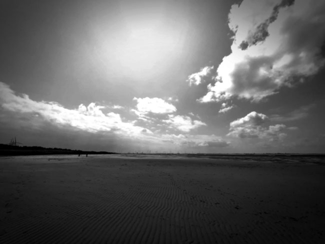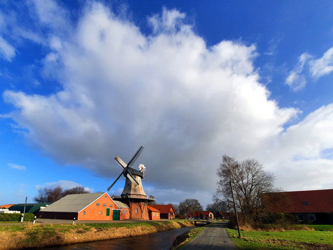 Ein eisiger Januarsturm aus Nordwest, angekündigte Sturmfluten, ein 400 Meter langes Containerschiff fährt sich vom Sturm weggedrückt vor Norderney fest, dann reißt plötzlich der graue Himmel auf, Jean Arps Wolkenskulpturen jagen sich darauf und zwischen den Wolken erscheint das spektakuläre friesische Blau, nicht das dezente der Sammeltassen und des Geschirrs, sondern das authentische, echte friesische Blau eines Winterhimmels. Nur ein extremes fotografisches Weitwinkel läßt diesen Aufzug nachvollziehen. Die Farbsensoren der Kameras reagieren bei dieser Farbintensität über und mich euphorisiert der Augenblick. Auch das Ziegelrot der Scheune erstrahlt in der Nachmittagssonne und gibt sein Bestes. Johannes Itten, der Bauhausanalytiker der Farbbezüge, hätte seine wahre Freude. Nach wenigen Minuten ist das Staunen vorbei und mit dem Heranziehen der nächsten Regenwand versinkt die Landschaft wieder im häufigeren Friesisch Grau.