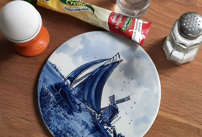 Früh geprägt durch die holländischen Motive bei meinen Großeltern in Küche, Bad und Wohnzimmer, fühle ich mich in den verwandten ostfriesischen Landschaften und Motiven zu Hause. Die kleinen Holzschuhe aus Keramik, die mir meine Großmutter von ihrer Busreise zum Keukenhof mitbrachte, die in allen Setzkästen der 60er Jahre standen, tanzen daar bij de molens in meinem Herzen, womit ich mich mit meinem Verhältnis zu Kitsch & Kunst geoutet habe. Schon als 14-Jähriger bin ich mit meinem Freund Thomas auf Radtour in den Niederlanden gewesen und habe mich bei Wind und Wetter durch die Weiten gekämpft. Die ersten Pommes frites meines Lebens, mit viel Mayonnaise, habe ich bei dieser Radtour (in diesem Zusammenhang ´leider´) auf dem Marktplatz von Antwerpen aus einer vor Öl triefenden Papiertüte genossen. Das war für mich bis heute, wenn ich daran denke, eine geschmackliche Detonation, die ich nie vergessen werde.
