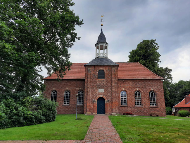 Es war nach 19 Uhr an einem verregneten Juliabend, als ich auf den Parkplatz neben der Maria-Magdalena-Kirche fuhr. Der Parkplatz war leer. Ich stieg aus, eine Taube gurrte über mir, ein Hund bellte etwas entfernt. 1556 waren die beiden Kirchspiele zusammengelegt worden und nach Baufälligkeit eines Vorgängerbaus entschied man sich 1783 an gleicher Stelle zu diesem achssymmetrischen Kirchenneubau, genau auf der Grenze zwischen den beiden Orten.