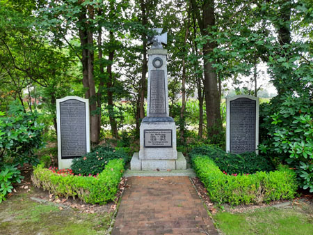 Zur Linken des Weges halte ich am Ehrenmal für die 56 im zweiten Weltkrieg Gefallenen beider Orte an. Was für ein unvorstellbares Leid für eine Bevölkerung von im Jahr 1939 632 Einwohnern. Bei den Reichstagswahlen 1938 hatten 395 Stimmberechtigte mit 388 Jastimmen für die NSDAP gestimmt (Quellennachweis unten). Tief in Gedanken mache ich die Aufnahmen der Kirche und gehe auf der linken Seite um die Kirche herum auf das Friedhofstor zu. Ein Mann steht mit gesenktem Kopf an einem Grab. Die Haltung erinnert mich an Millets Angelusläuten von 1859.