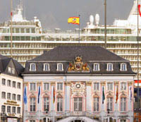 ... im Besonderen zum Motiv der schwimmenden Hotelburgen: Durch Fotos von den Besuchen beängstigend monumentaler Kreuzfahrtschiffe im Zentrum Venedigs abgestoßen, habe ich um 2019 angefangen, hochhausartige Längsseiten von Kreuzfahrtschiffen in Ansichten bekannter Städte, hier das Bonner Rathaus, zu montieren, um auf die Bedrohung Venedigs durch diese aggressive Form des Massentourismus hinzuweisen. Verschiedene Motive dieser Serie habe ich zu einer geplanten Wanderausstellung zwischen den Partnerstädten Bonn und Bozen eingereicht, aber meine Montagen fanden leider keine Zustimmung der Juroren des Bonner Künstlerforums.