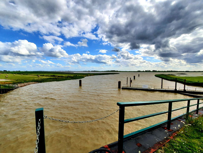 Oldersum, Schleuse am Oldersumer Sieltief, Blick auf die Ems