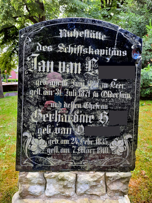 Am Grabstein des Kapitäns und seiner Ehefrau, in Jugendstil-Ornamente gefasst,