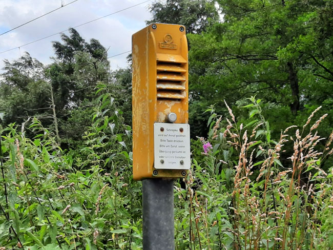 Auf dem Weg zum Sauteler Siel fahre ich auf einer engen Straße am Kanal lang. An einer geschlossenen Schranke der Bahnstrecke Leer-Emden muss ich halten. Zwischen geschossenem Unkraut steht eine ältere Wechselsprechanlage, deren Knopf ich drücken muss. Ein freundlicher Schrankenwärter erklärt mir über den knarzenden Lautsprecher, dass er gerne nach dem erwarteten Zug die Schranke öffnen würde. So war es, Danke!