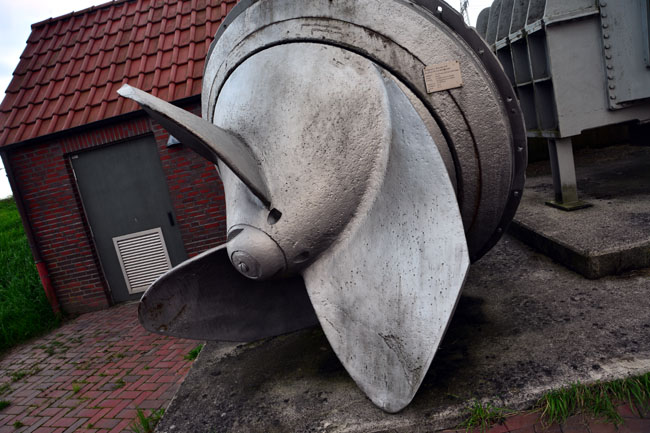 Die ehemalige Schraube einer Schraubenpumpe aus dem Schöpfwerk Moormerland in Oldersum, mit deren Hilfe bis zu 20 Kubikmeter Wasser in der Sekunde aus den tiefer liegenden Kanälen in die Ems hochgepumpt werden konnten.