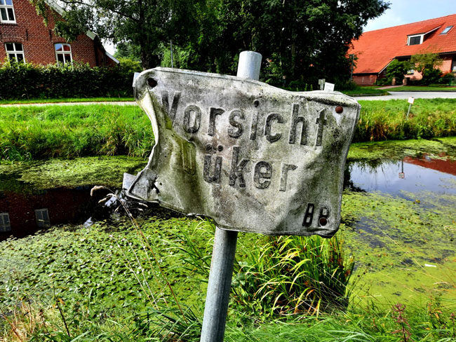 Ich genieße die Weite dieser großen Wasserfläche und die wilden friesischen Wolken, die schnell dahinziehen. Auf dem Schild vor dem Landesteg steht: Zutritt nur für Mitglieder, Yacht-Club Sauteler Siel und Berechtigte. Im Internet finde ich Hinweise auf erfolgversprechende Angelplätze entlang des Kanals und Fotos von strahlenden Anglern mit großen toten Fischen im Arm. Kaum habe ich meine Aufnahmen gemacht, parkt ein jüngerer Mann seinen Kombi neben mir, mustert mich streng und kontrolliert den Steg. Der ganze Parkplatz ist nicht als schön zu bezeichnen und fällt in die Parkplatz-Kategorie Abstellplatz für Schrott, Murks und Müll. Auf der anderen Seite der Schöpfwerkstraße befindet sich hinter dem Deich der eben genannte Yacht-Club, wo ich gerne meine Motive suchen würde. Eine Schranke und weitere Verbotsschilder nehmen mir meine Lust, außerdem schießt schon wieder der junge Mann mit seinem Kombi heran und parkt vor der Schranke. Ich ziehe mich zurück. Aus Richtung Leer nähern sich auf dem Deich zwei ostasiatische Wanderer, hochbepackt mit Rucksäcken, die über ihrer Wanderkarte wild gestikulieren. In Ostfriesland darf man vieles nicht!