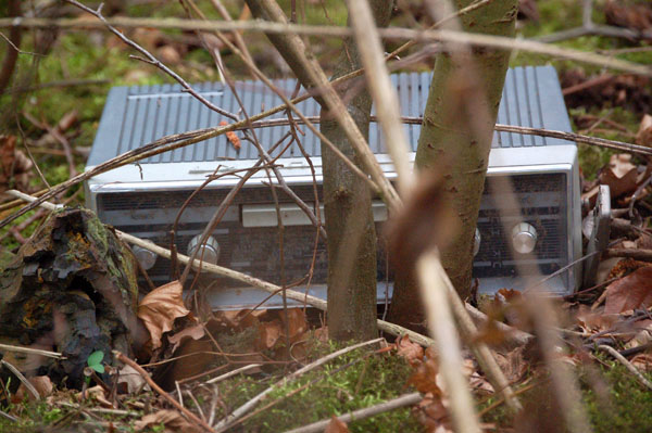 in der hecke am weg hinter den häusern liegt ein altes kofferradio