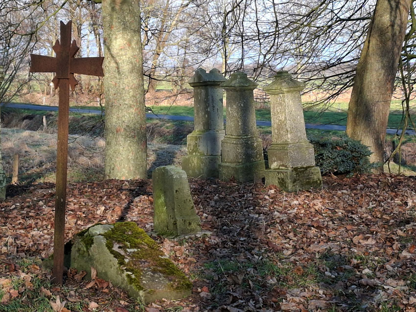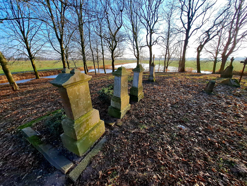 Ich suche rechts einen Weg durch das abgestorbene Dickicht, um die zwischen den Baumstämmen ungeordnet stehenden Kreuze der Grabstellen auf dem Plateau der Warft im Gegenlicht fotografieren zu können. Ich muss aufpassen, dass ich nicht in den zugefrorenen Graben hinter mir abrutsche. Nach einer Serie von digitalen Fotos im Kleinbildformat mit einem klassischen 24mm Weitwinkel und Dokumentationsfotos mit dem Handy, steige ich zwischen den schief stehenden von Flechten grünlich verfärbten Grabstelen zur Kuppe der Warft auf. Die Stelen sind sorgfältige Steinmetzarbeiten, jahrhundertelang den klimatischen Angriffen des Wetters ausgesetzt.